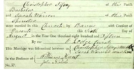 Less than two months after news reached reached Britain of Napoleon’s defeat at the Battle of Waterloo, Christopher was living in Barking in Essex. It was probably here that he met Sarah Warren. Perhaps as young as 15, she was considerably younger than Christopher when they married on 6 August 1815 at the Church of St Margaret, ‘with consent’ in view of the bride’s age. It was not uncommon for men to marry women much younger than themselves but it was unusual that Christopher had not married earlier, so perhaps Sarah was his second wife. Bride and groom both made their ‘mark’ in the register (pictured right).