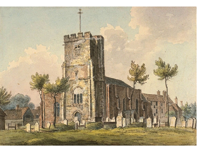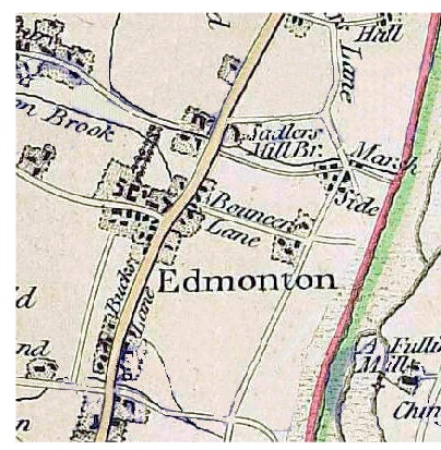 The family moved again between 1824 and 1827, this time to Edmonton. The view on the right shows Edmonton at about this time. It was a genteel town which had flourished in the eighteenth century, as fashionable residents increasingly settled there, many of them attracted by the regular coach services to London. However, by the nineteenth century, it had begun to lose its exclusiveness, and as prosperous traders moved in, the gentry moved out. According to the author, John T Smith, by 1800 it was inhabited by "retired embroidered weavers, their crummy wives and tightly laced daughters". Parts of the town also came to be covered with small, overcrowded tenements and lodging houses.